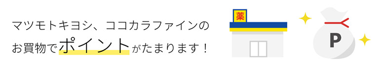 マツモトキヨシ、ココカラファインでお買物のたびに100円(税抜)=1ポイントがたまります。