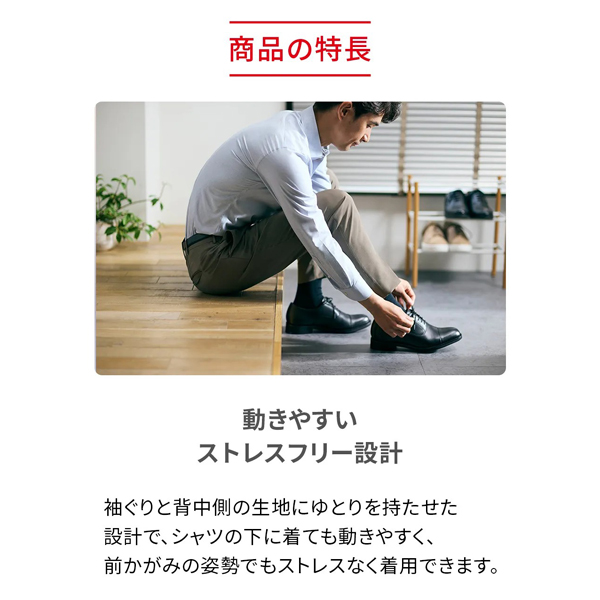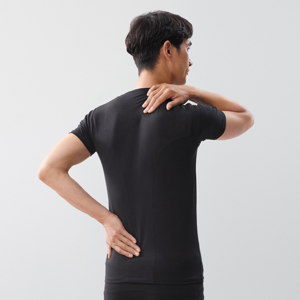 血行促進繊維VITALTECH(R)を使用した生地を二重にした「Wバイタル構造」により、肩コリ・腰コリを改善。服の下に着るだけでコリに集中アプローチ。肩や腰のコリ改善をかなえるインナーです。