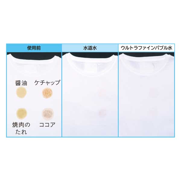 【試験方法】4種類の食品汚れ(醤油、ケチャップ、焼肉のたれ、ココア)を塗布したTシャツをReFa ULTRA FINE BUBBLE LAUNDRYを取り付けた洗濯機と取り付けていない洗濯機でそれぞれ洗浄し、乾燥させた。その後、仕上がりの汚れ落ちを比較した。【試験品】ReFa ULTRA FINE BUBBLE LAUNDRY ※メーカー調べ